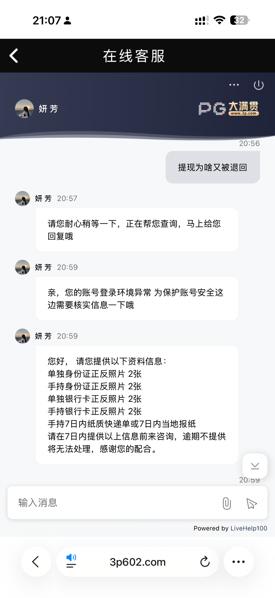 玩这个平台五六年了,冲了也有大几万了vip3。最近有个快两年没充值过了,想着今天充值玩一下,充值了150,提1100直接退回,说环境异常要提供一堆手持照片。这个账号最开始是绑定的我妈的银行卡,但是从来没有用银行卡提现过,都是提虚拟币。客服说让我提供我妈的手持身份证和银行卡照片还有手持七天内快递单照片。真他妈傻逼啊,老玩家都整,真牛逼。大家避雷吧,避免大额充值,看这尿性改名之后没啥格局了。